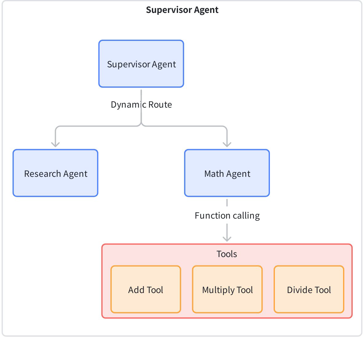 • 多层级智能体结构:实现了一个顶层 Supervisor Agent,管理两个子智能体 ——Research Agent(负责信息检索)和 Math Agent(负责数学运算)。