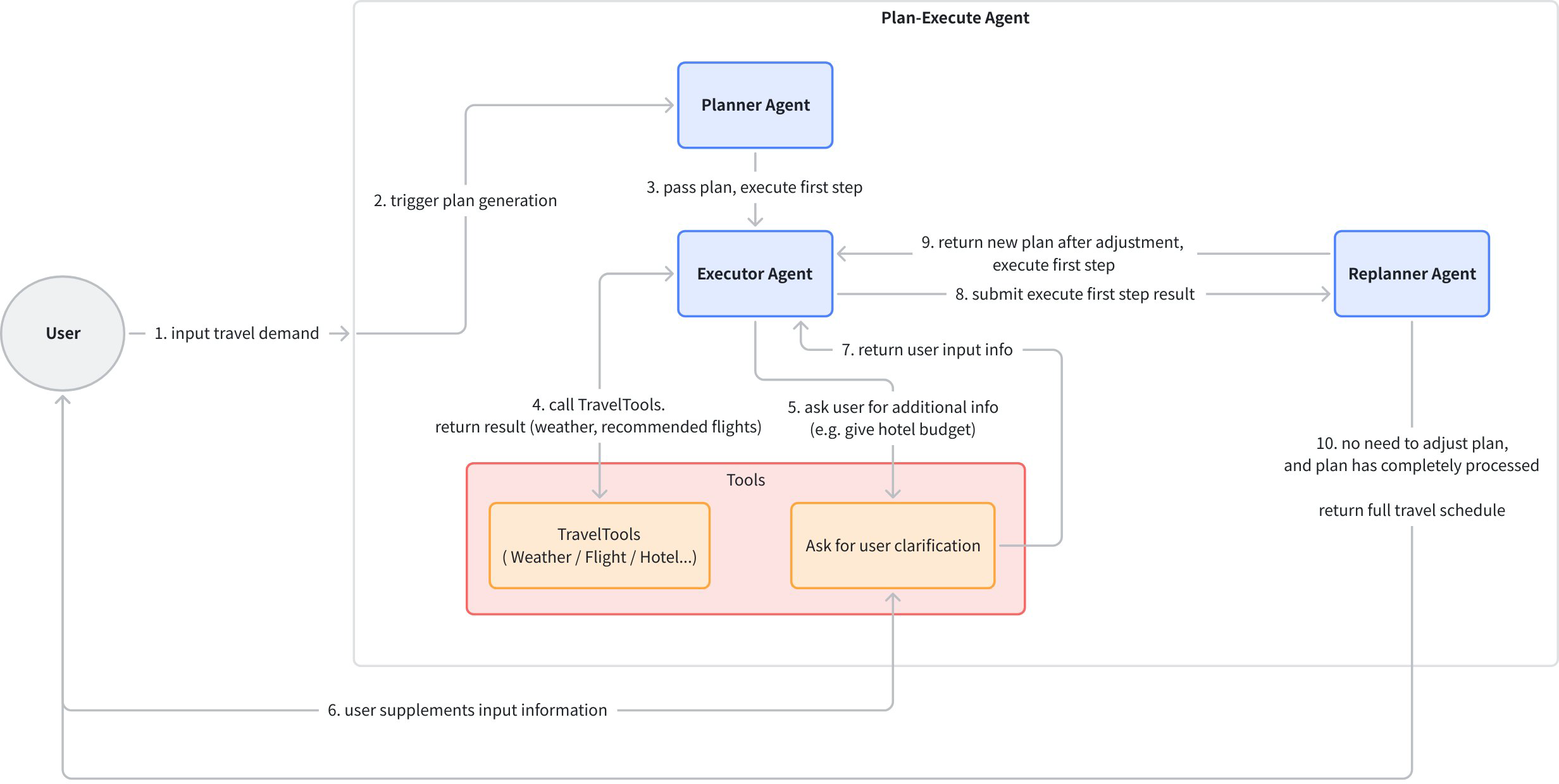 • 第二层是由 execute + replan agent 构成的 loop agent,即 replan 后可能需要重新 execute(重新规划后需要查询旅行信息 / 请求用户继续澄清问题)