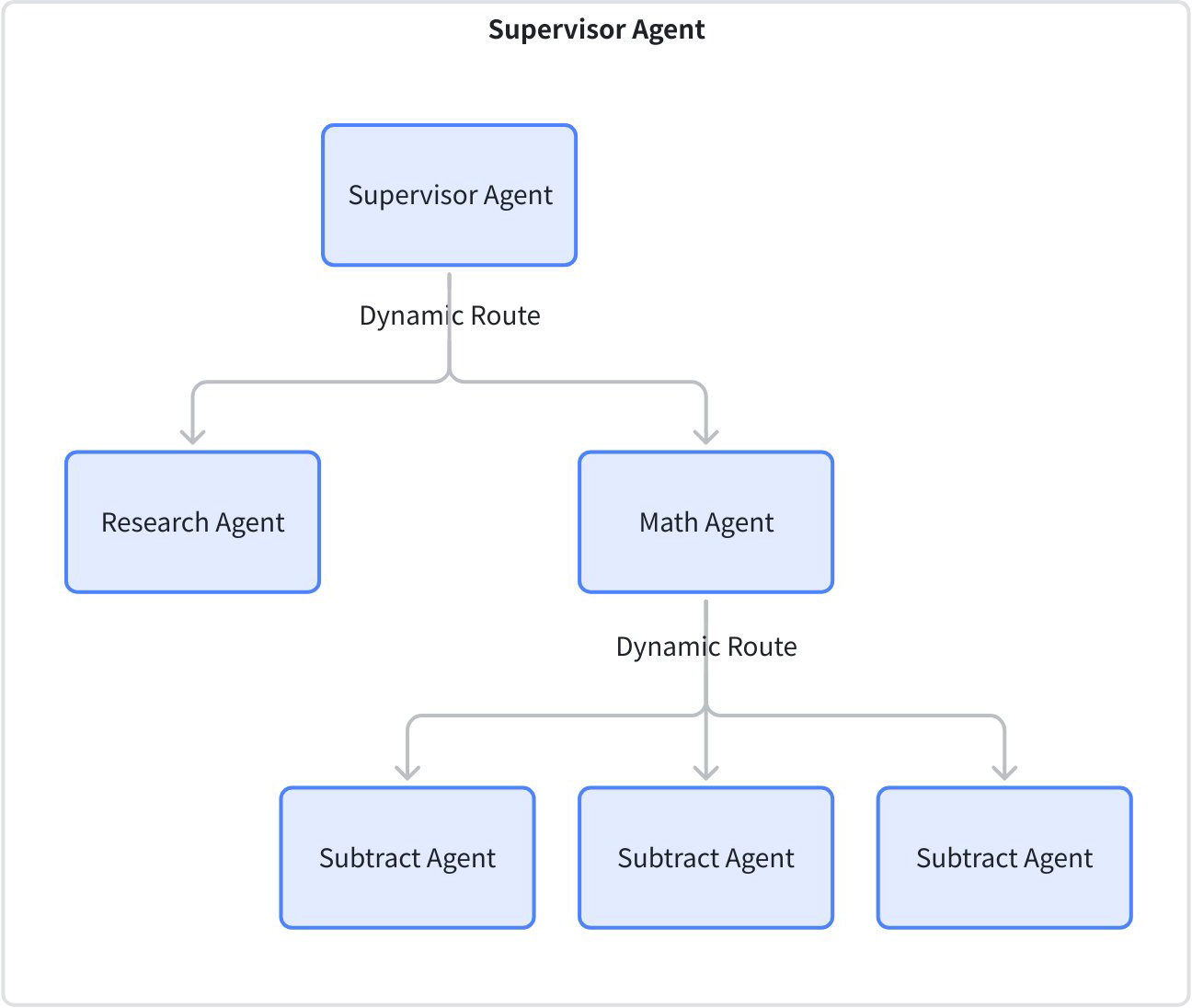• Math Agent 内部再细分三个子智能体:Subtract Agent、Multiply Agent 和 Divide Agent,分别处理减法、乘法和除法运算,体现多级监督和任务委派。