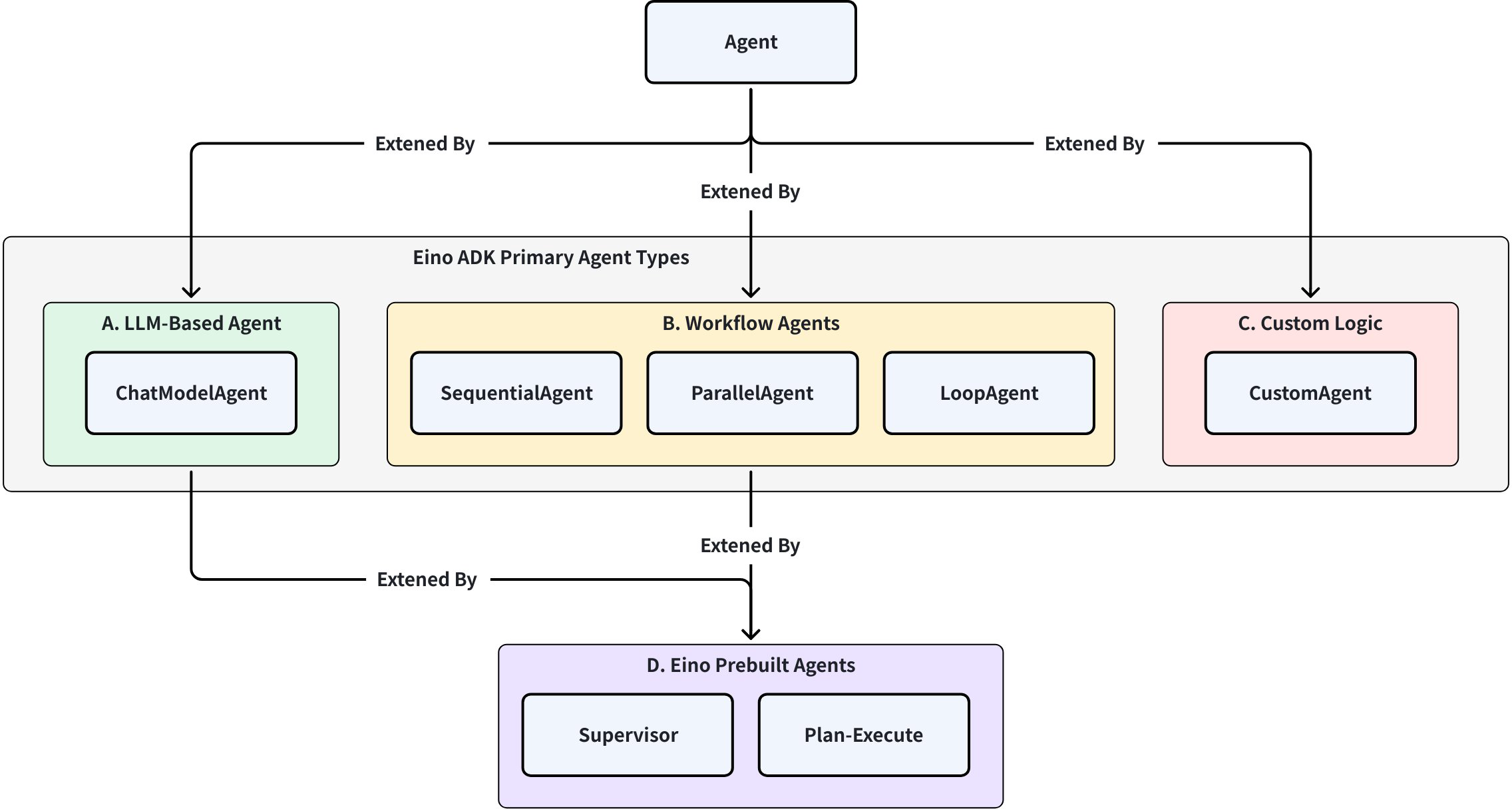 类别ChatModel AgentWorkflow AgentsCustom LogicEinoBuiltInAgent(supervisor, plan-execute)